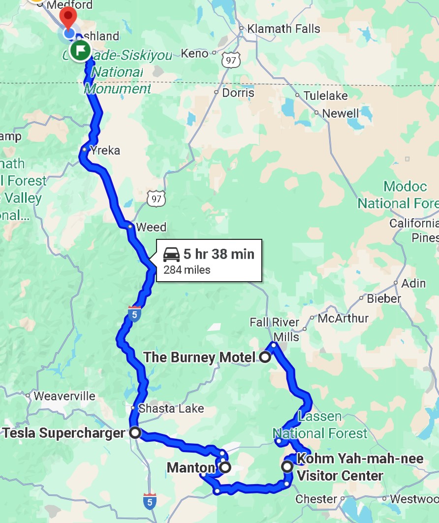 The peak is at 10,457 ft. Driving required us to go up to 8511 feet. After our time in the park, we drove to Redding to the Tesla Supercharger and then headed home.