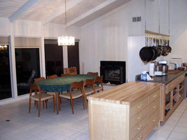 Here is the kitchen with both the cabinet and the maple table lined up across from the original kitchen. I've added 15 feet of work space to the 1.5 feet of prep area that was in the original. I've just finished the table and am slowly moving into the drawers. I'd like to keep the top empty so I can use it for plating dishes when I have dinner parties. Of course, nature abhors an empty horizontal surface...