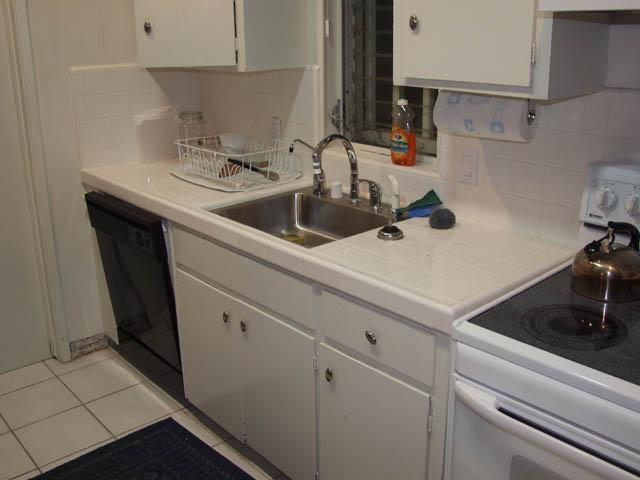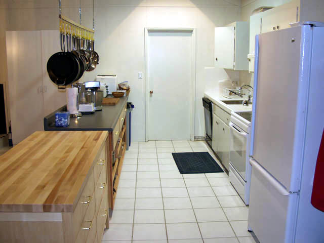 When I moved in, the kitchen was just along the outside wall. There was 3 feet of counter to the left of the sink and 2 feet to the right. This space is usually taken up with clean and dirty dishes.