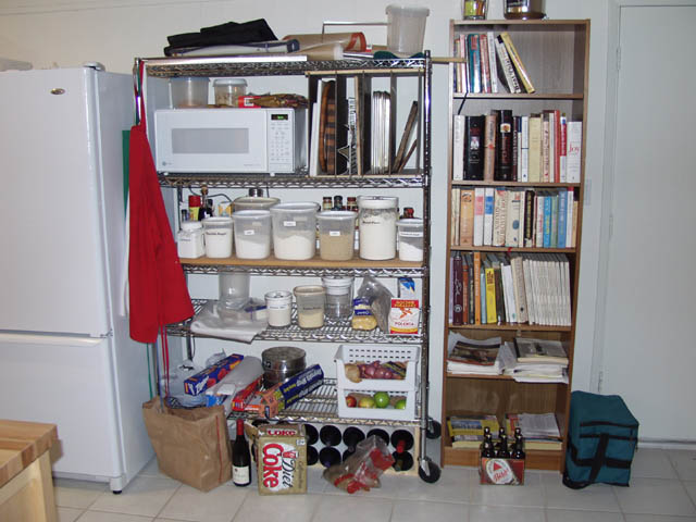 To the right of the refrigerator I added some metal shelves and a bookcase for cookbooks. I installed a couple of new electrical circuits in the wall behind the shelves so I'd have a good place to plug in the microwave and the fridge. I made a small set of vertical shelves for cookie sheets, etc.