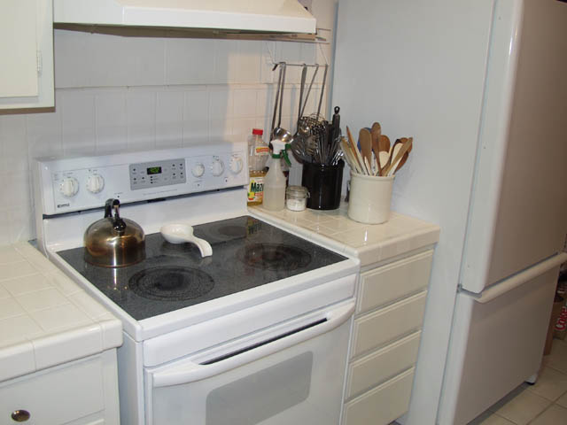 There was also about 18 inches of counter between the stove and refrigerator. A prep area of sorts. There is an electric stove, which I don't much like, but there is no gas in the kitchen and the hood doesn't actually exhaust to the outside. I'm living with electricity for the few months I'm here.
