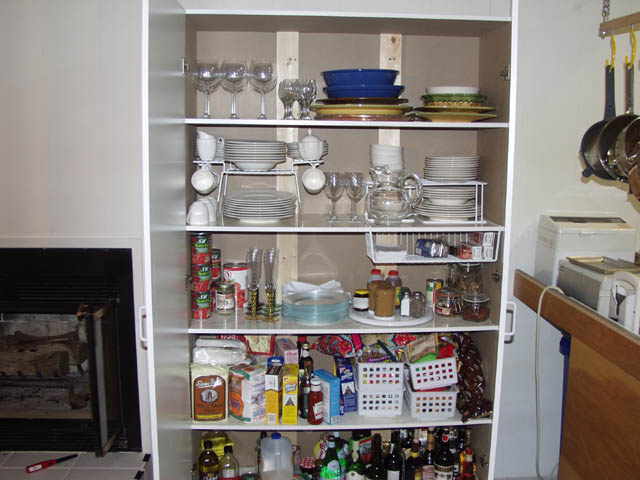 This was a prefab garage cabinet. It was pretty flimsy, with the shelves supported only at the side edges. I knew I was planning to have china and canned goods, so I re-engineer the cabinet as I was assembling it and support the shelves at two place in the back as well (you can see the 1 x 4 boards that I added.